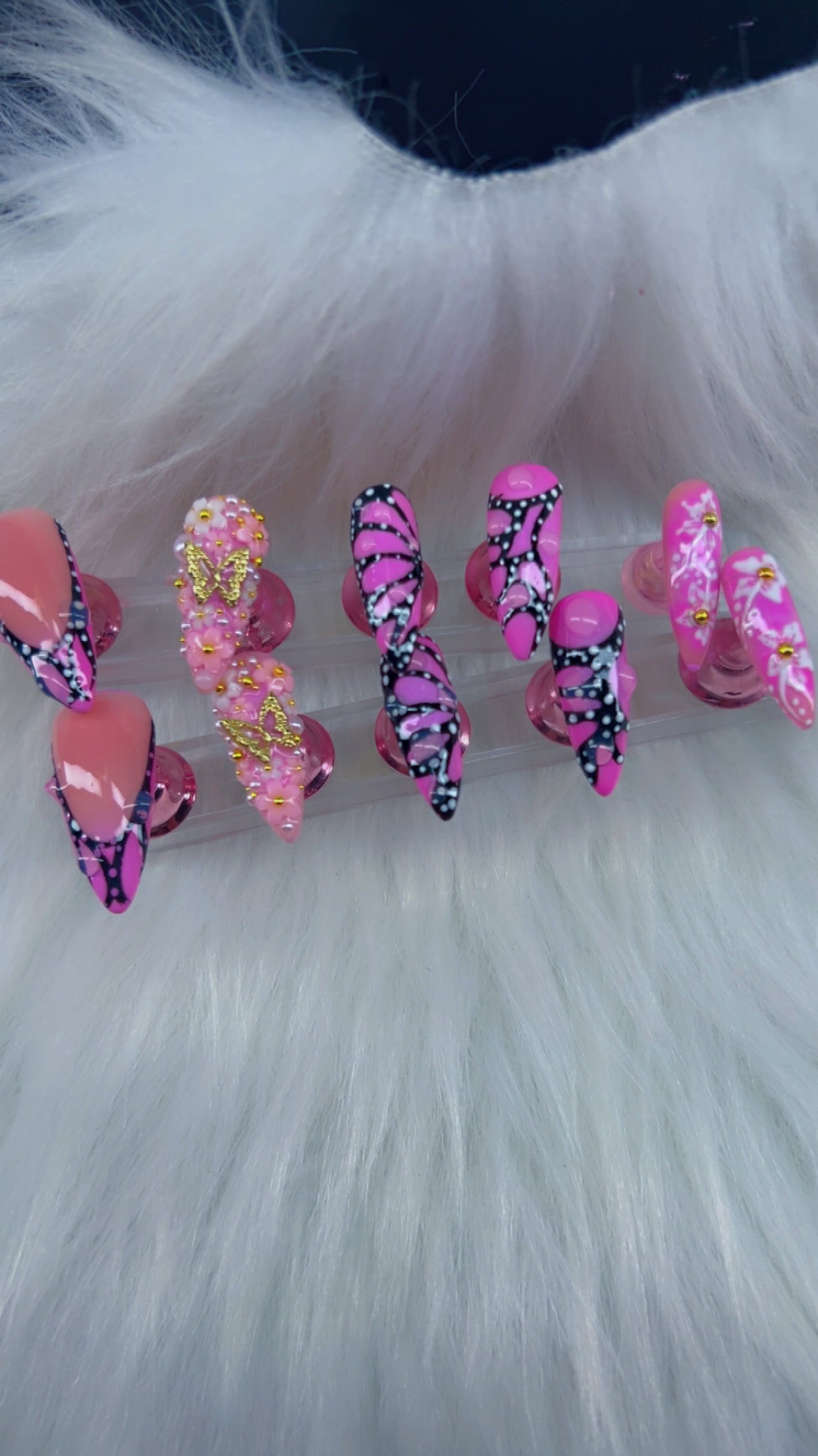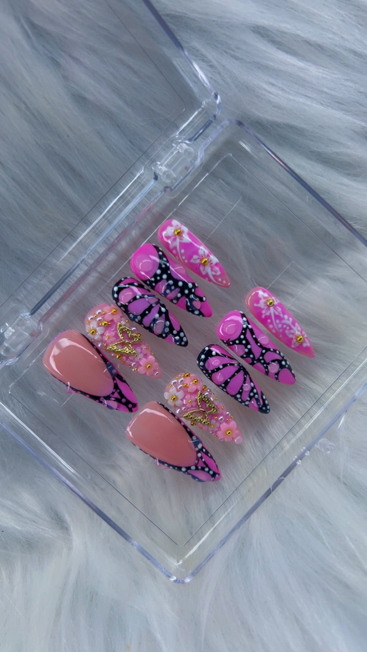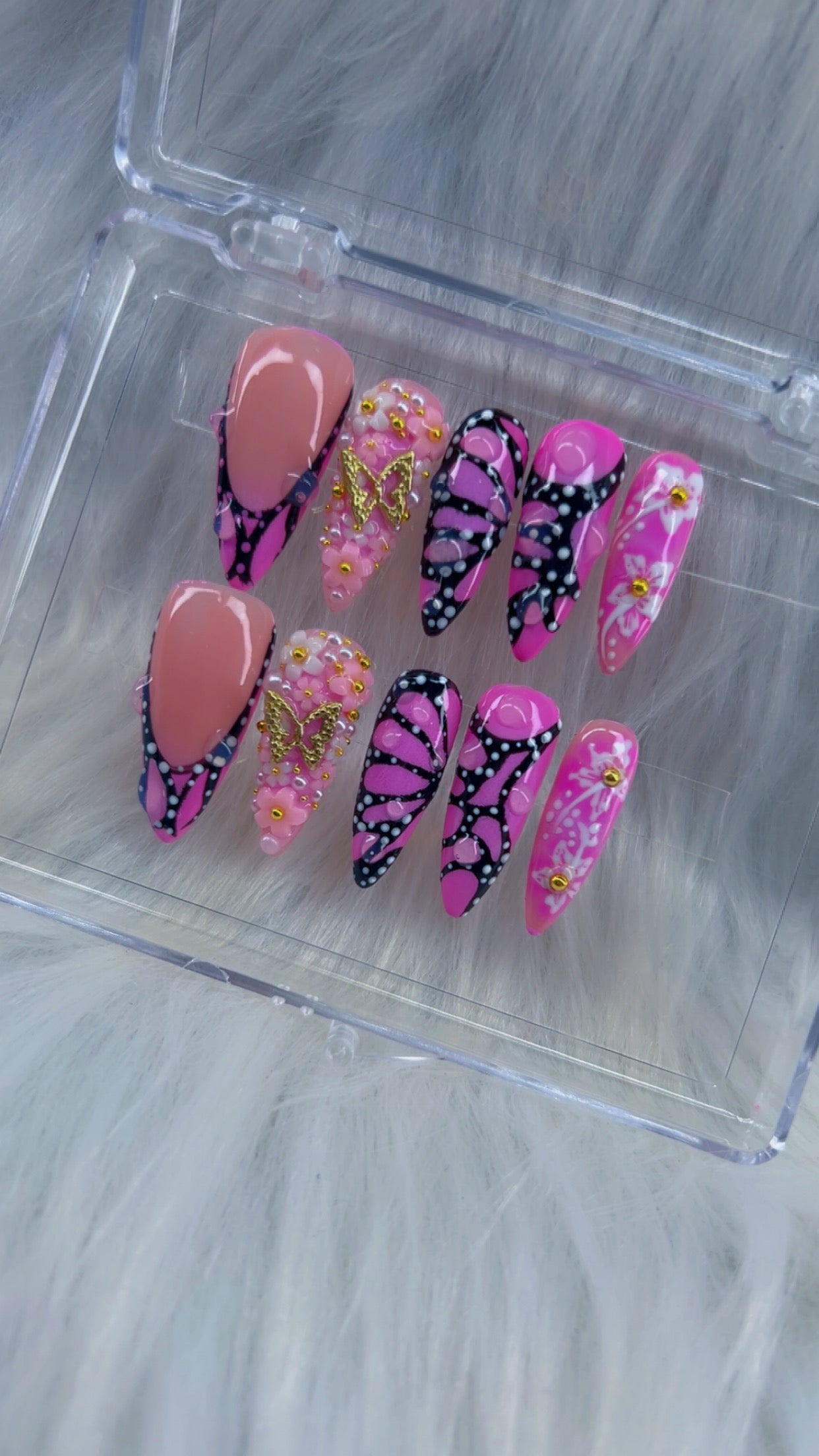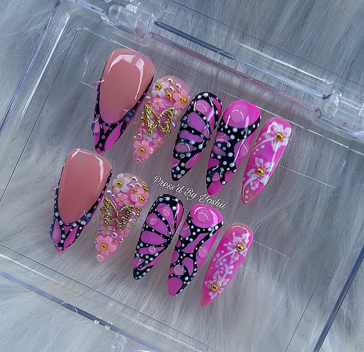 “Press’d to Fly” — Take flight in style. This set features shimmering pink butterfly wings, 3D floral accents, and luxe gold details that command attention. Soft beauty meets fearless edge — perfect for the ones who aren’t afraid to spread their wings and stand out. When you think of Press’d By Yoshii Know These Nail represent the brand!